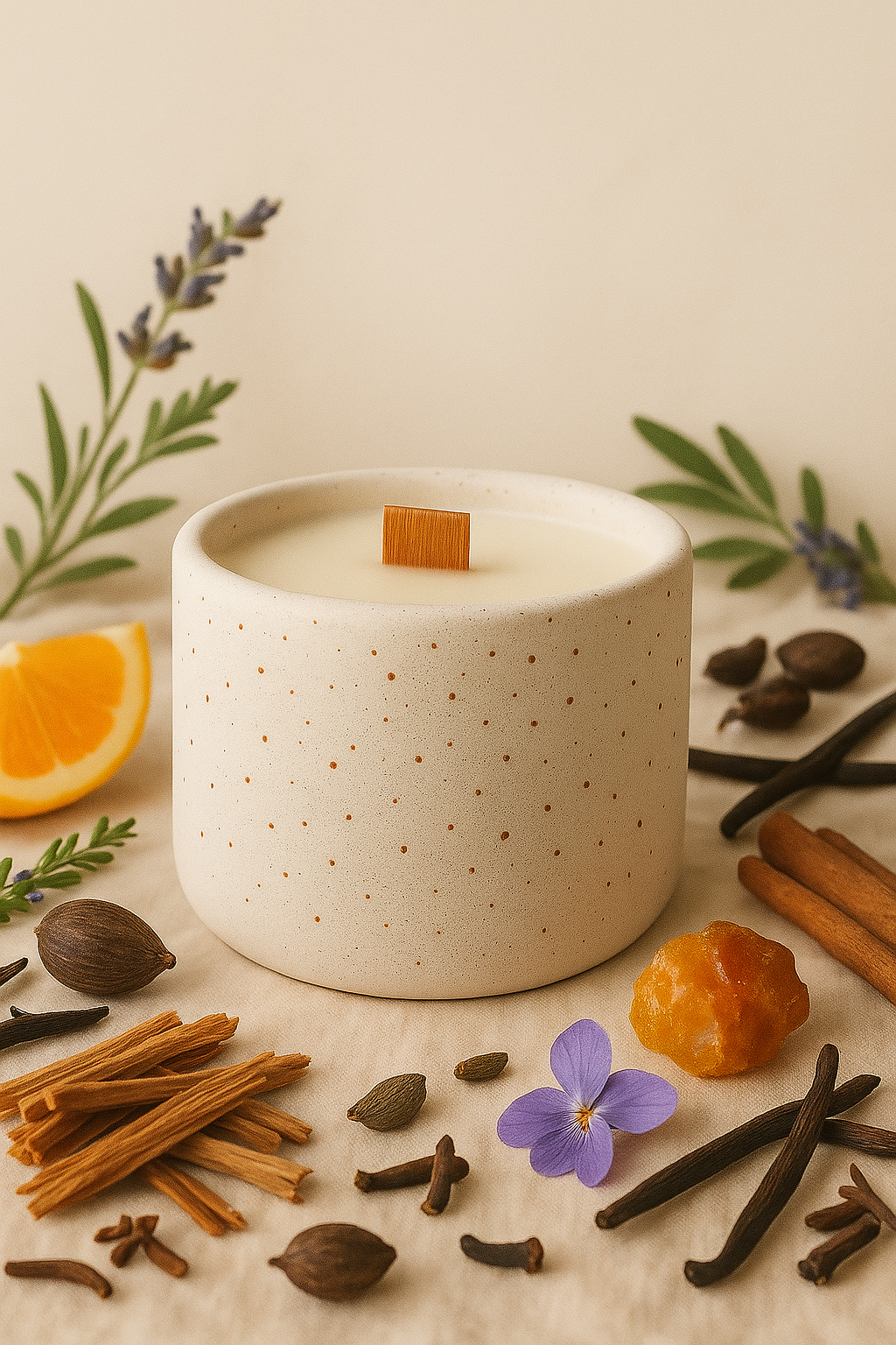 Hand-poured in a handmade vessel with natural wax and a crackling wood wick, this 8 ounce candle should burn at 30 - 50 hours under regular conditions. Each candle is made in small batches and is one of a kind.